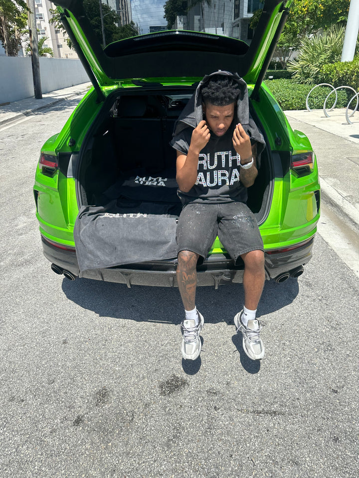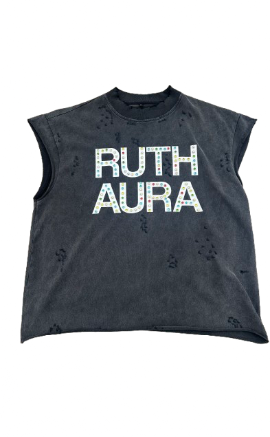 Design: The front showcases bold, oversized block lettering in crisp white, adorned with vibrant rhinestones that catch the light and bring a dynamic, colorful edge. It’s a statement piece that commands attention and elevates any outfit.